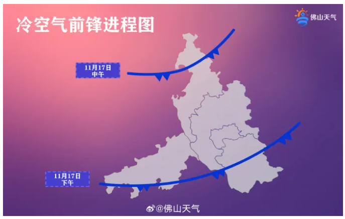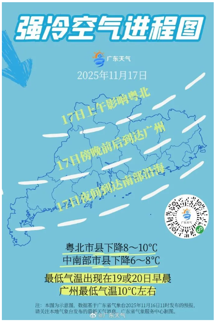 据@广东天气,强冷空气11月17日上午影响粤北、傍晚到达广州、夜间到达南部沿海;18-19日,气温较17日明显下降,过程气温下降幅度:粤北市县下降8~10℃,中南部市县下降6~8℃。大部分市县过程最低气温出现在19或20日早晨:粤北和珠江三角洲北部市县6~9℃(粤北高海拔山区1~3℃),南部沿海市县13~15℃,其余市县9~12℃。