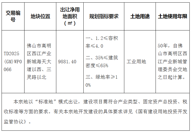 本块地其他规划建设要求按《高明区土地使用规划条件》(佛规明设函〔2025〕0109号)执行。