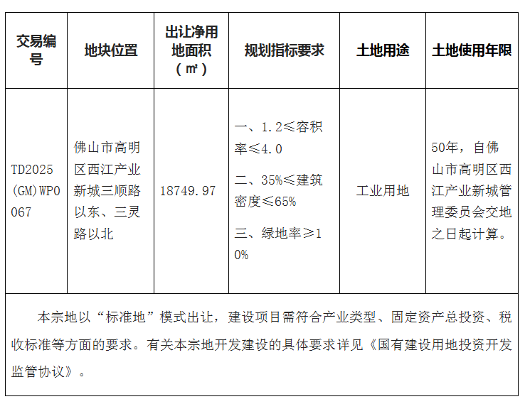 本块地其他规划建设要求按《高明区土地使用规划条件》(佛规明设函〔2025〕0114号)执行。