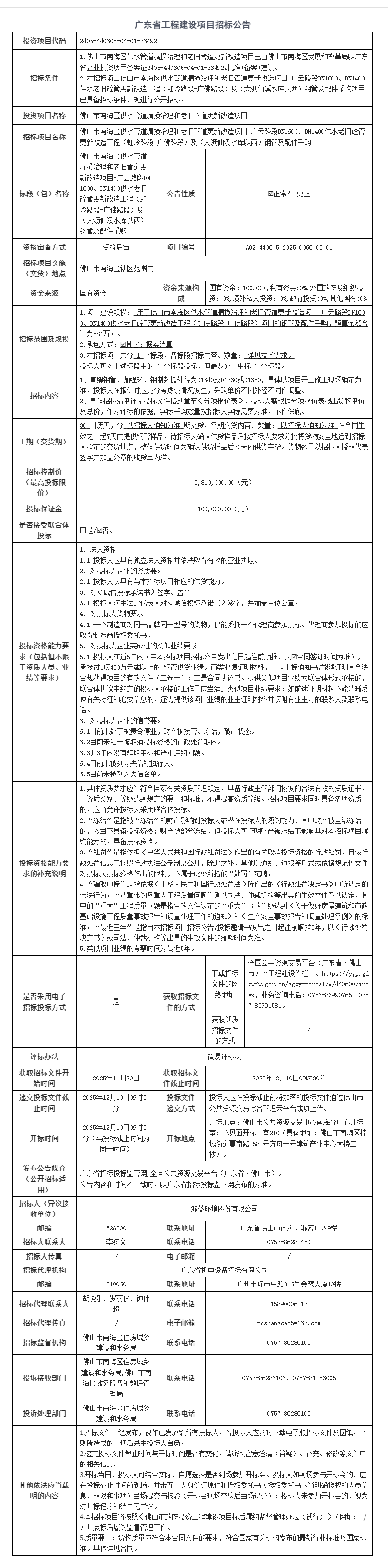 南海里水镇环镇北路工程项目(里官路至佛山一环段)自动扶梯和电梯设备招标公告