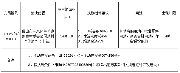 五、有意参与竞租者可于2025年11月19日后登录网上交易系统下载TD2025(SS)WG0004地块的《佛山市三水区农村集体经营性建设用地使用权网上挂牌出租文件》。