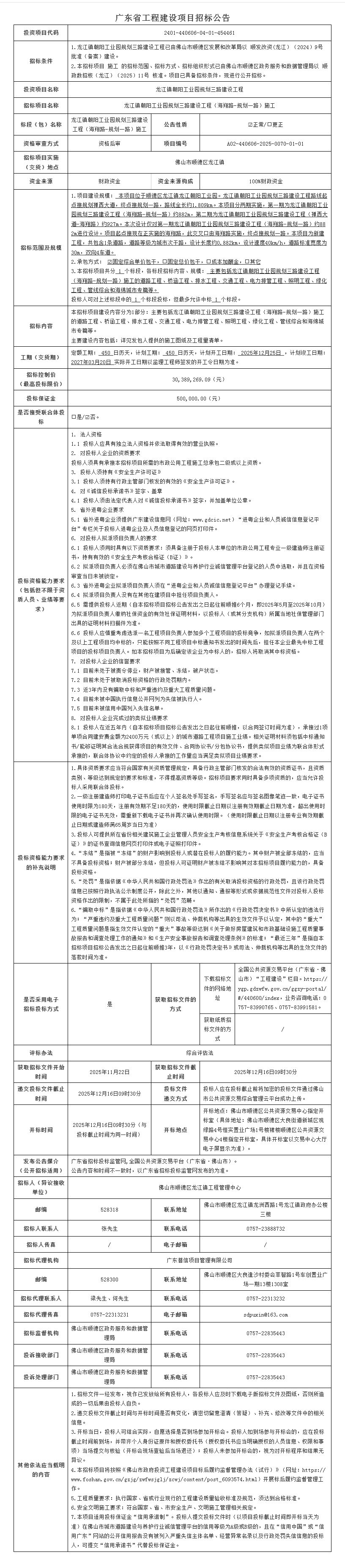 顺德龙江镇朝阳工业园规划三路建设工程(海翔路-规划一路)施工招标公告
