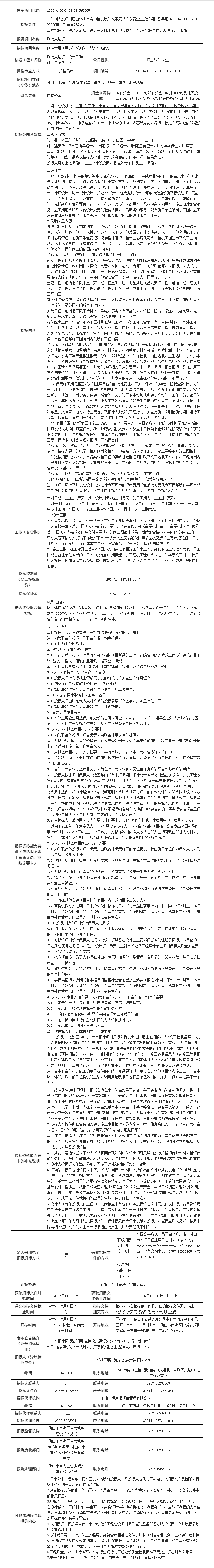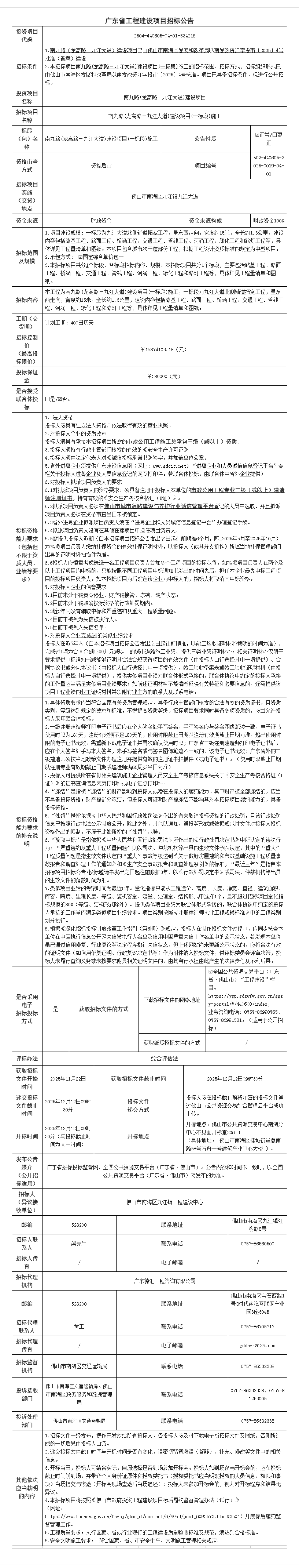 概述:本招标项目南九路(龙高路-九江大道)建设项目(一标段)施工的招标范围、招标方式、招标组织形式已由佛山市南海区发展和改革局以南发改资江字投审〔2025〕4号核准......