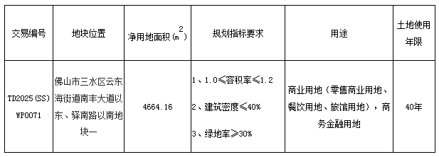 五、有意参与竞买者可于2025年11月21日后登录网上交易系统下载TD2025(SS)WP0071地块的《佛山市三水区国有建设用地使用权网上拍卖出让文件》。