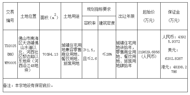 五、有意参与竞价者可登录佛山市国有建设用地使用权和矿业权网上交易系统(下称“网上交易系统”,网址:http://jy.ggzy.foshan.gov.cn:3680/TPBank/newweb/framehtml/onlineTradex/index.html)、广东省公共资源交易平台(佛山市)(网址:https://ygp.gdzwfw.gov.cn/#/440600/index)以及佛山市南海区人民政府网(网址:http://www.nanhai.gov.cn)佛山市公共资源交易中心南海分中心网页下载相关出让文件。