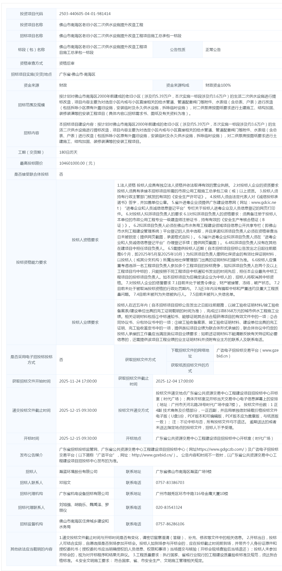 南海里水镇环镇北路工程项目(里官路至佛山一环段)自动扶梯和电梯设备招标公告