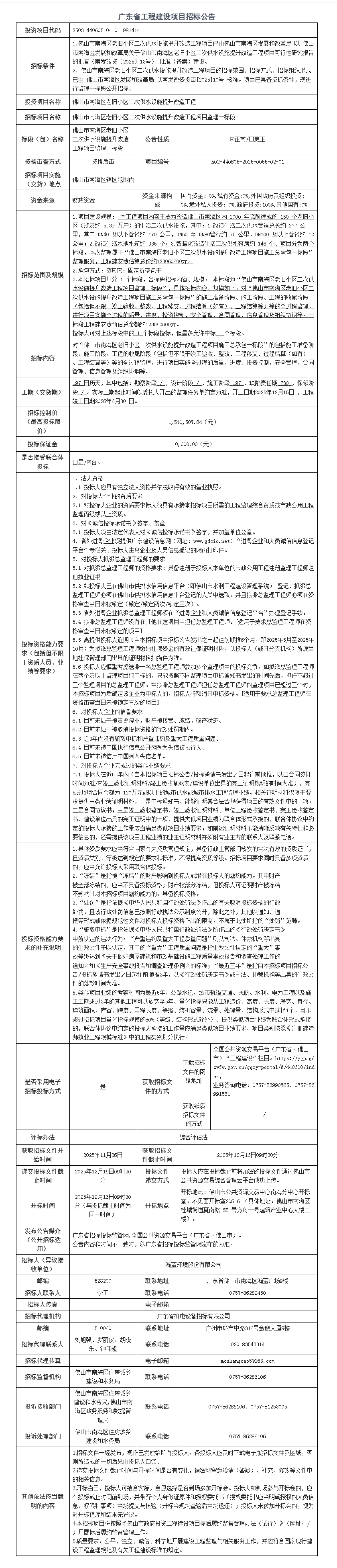 概述:佛山市南海区老旧小区二次供水设施提升改造工程项目的招标范围、招标方式、招标组织形式已由 佛山市南海区发展和改革局 以南发改资投审[2025]10号 核准......