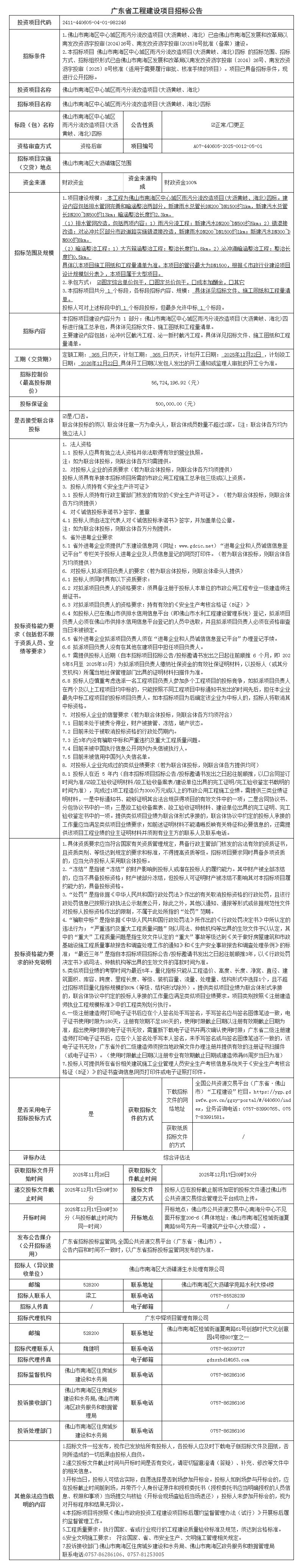 佛山市南海区中心城区雨污分流改造项目(大沥黄岐、海北)二标招标公告
