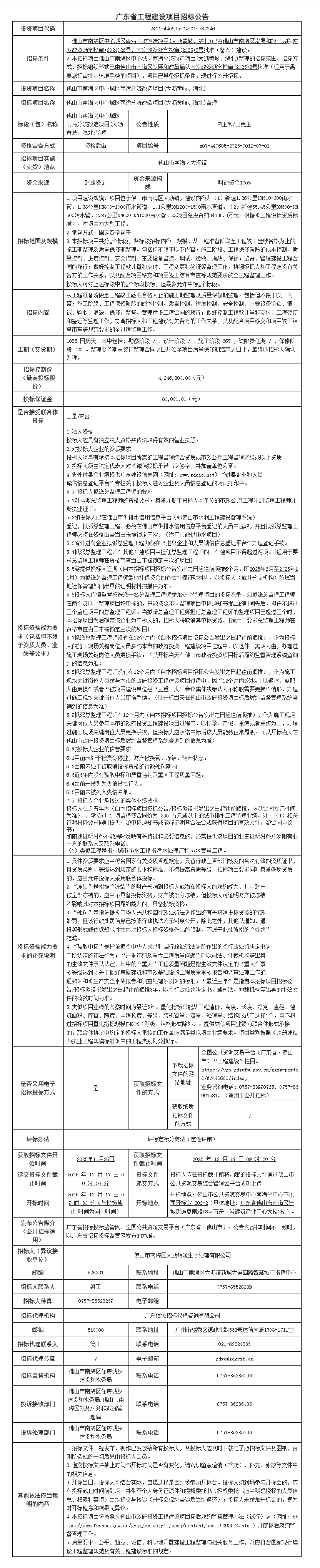 佛山市南海区中心城区雨污分流改造项目(大沥黄岐、海北)监理招标公告
