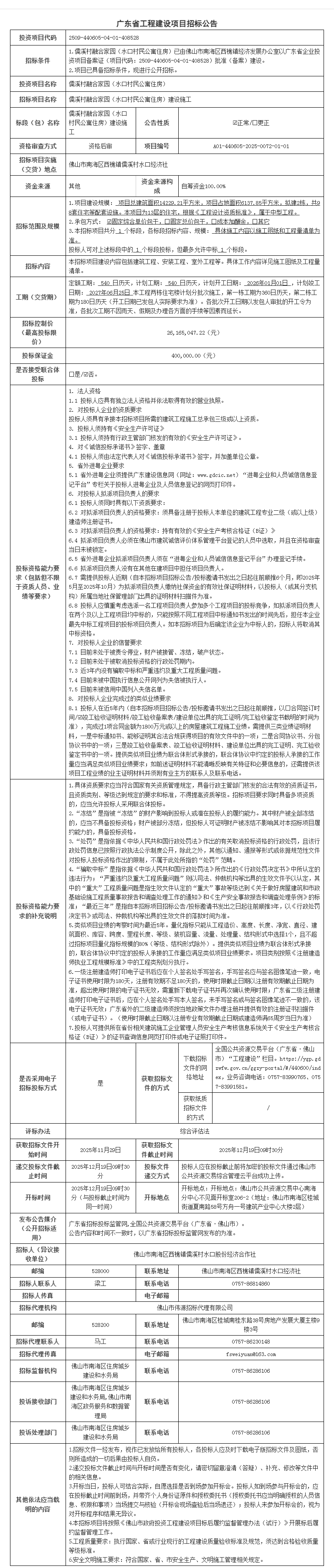 概述:佛山市南海区中心城区雨污分流改造项目(大沥黄岐、海北)已由佛山市南海区发展和改革局 以南发改资沥字投审(2024)26号、南发改资沥字投审(2025)8号批准(备案)建设......