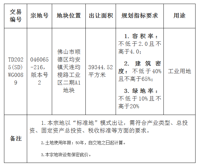 佛山市顺德区均安镇天连均榄路工业区二期A1地块网上挂牌出让