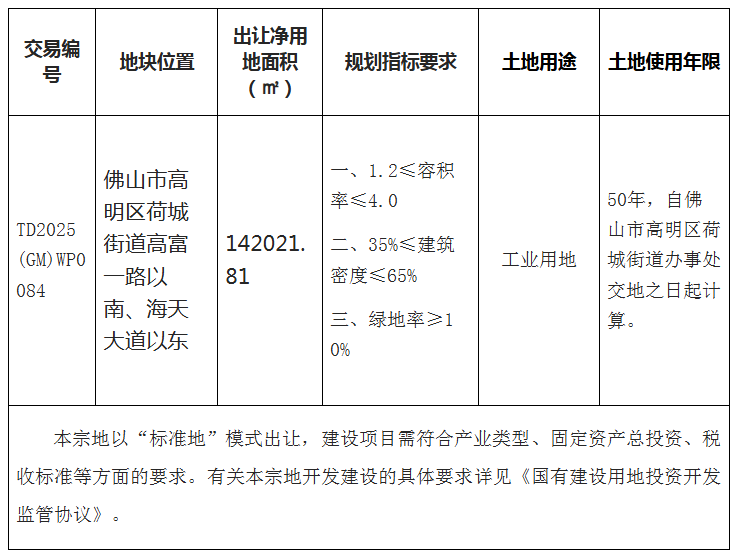 本块地其他规划建设要求按《高明区土地使用规划条件》(佛规明设函〔2025〕0125号)执行。