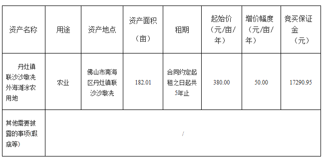 2.佛山市公共资源交易中心南海分中心通过佛山市资产交易网上交易系统及粤公平网站发布的项目信息(包括但不限于公告信息、交易文件、合同条款等)并不构成佛山市公共资源交易中心南海分中心对项目的任何交易建议。意向竞买人应不依赖于已披露的项目信息并自行对项目的相关情况进行必要的尽职调查和充分了解,对是否竞买该项目及项目成交后可能发生的费用和存在的风险自行作出充分评估,并独立承担所有风险。意向竞买人一经申请参加竞买,即视为知晓、认可项目现状,佛山市公共资源交易中心南海分中心对此不承担任何法律责任。