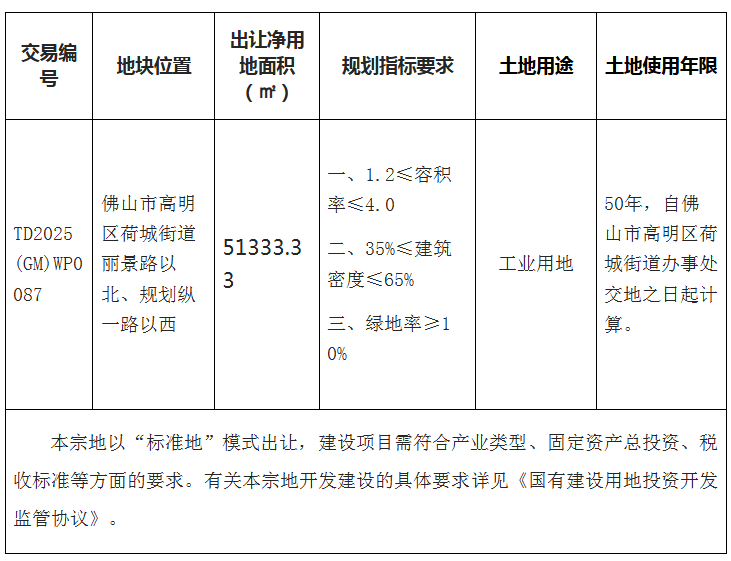 九、自本次公告起至网上挂牌截止期间,如有关于本宗地网上挂牌文件的修改、澄清、说明等将通过广东省公共资源交易平台和佛山市国有建设用地使用权和矿业权网上交易系统进行发布,有意参与竞租者请密切留意。其它未尽事宜,详见该地块的交易文件。