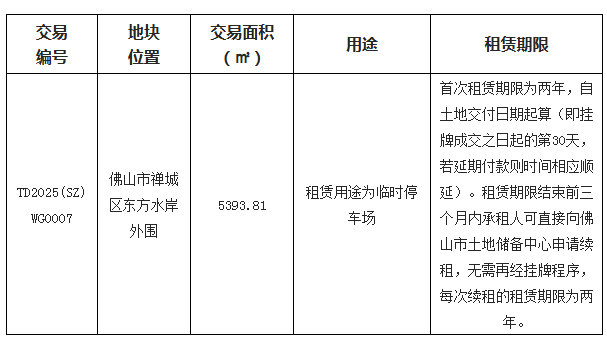 四、有意参与竞租者可于2025年12月2日后登录网上交易系统下载TD2025(SZ)WG0007地块的《佛山市国有建设用地使用权网上挂牌租赁文件》。