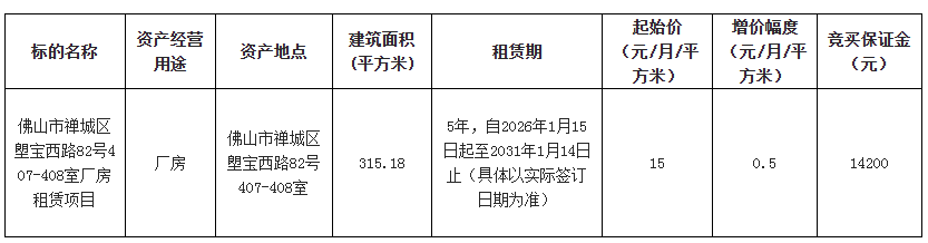 4.产权证照情况:有产权证照(竞买人应充分考虑其风险,一经存入竞买保证金即表示承认、接受本项目的现状,愿意按约定支付租赁价款和遵守租赁合同的约定)。