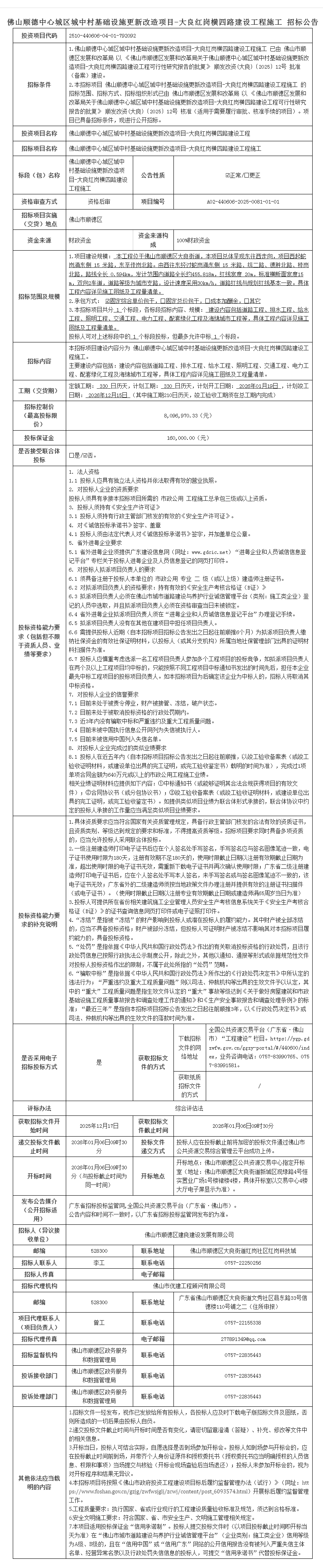 佛山顺德中心城区城中村基础设施更新改造项目-大良红岗横四路建设工程施工招标公告