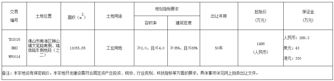 八、自本次公告起至网上拍卖截止期间,如有关于本宗地竞买文件的修改、澄清、说明等将通过网上交易系统以及佛山市南海区人民政府网发布,请有意参与竞买者密切留意。其它未尽事宜,详见本宗地的网上拍卖出让文件。