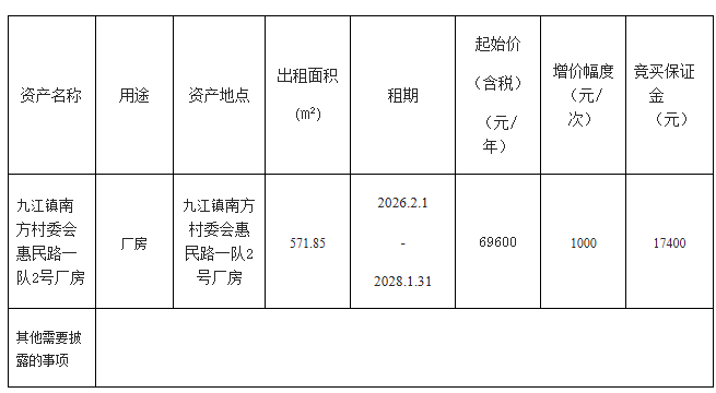 南海九江镇南方村委会惠民路一队2号厂房租赁公告