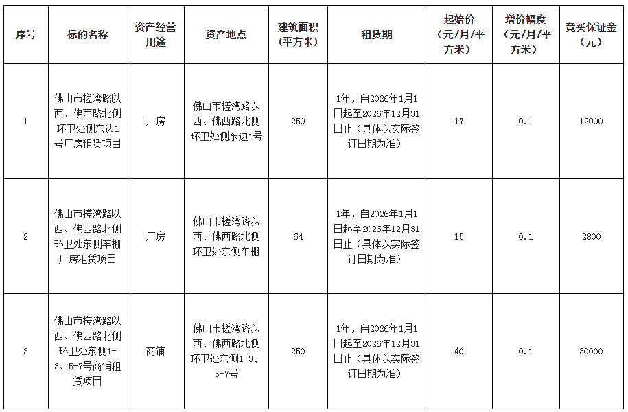 7.优先承租/购买权情况:佛山市柒伍柒科技有限公司洁而美汽车美容中心为序号1、序号2及序号3标的物优先承租权权利人。