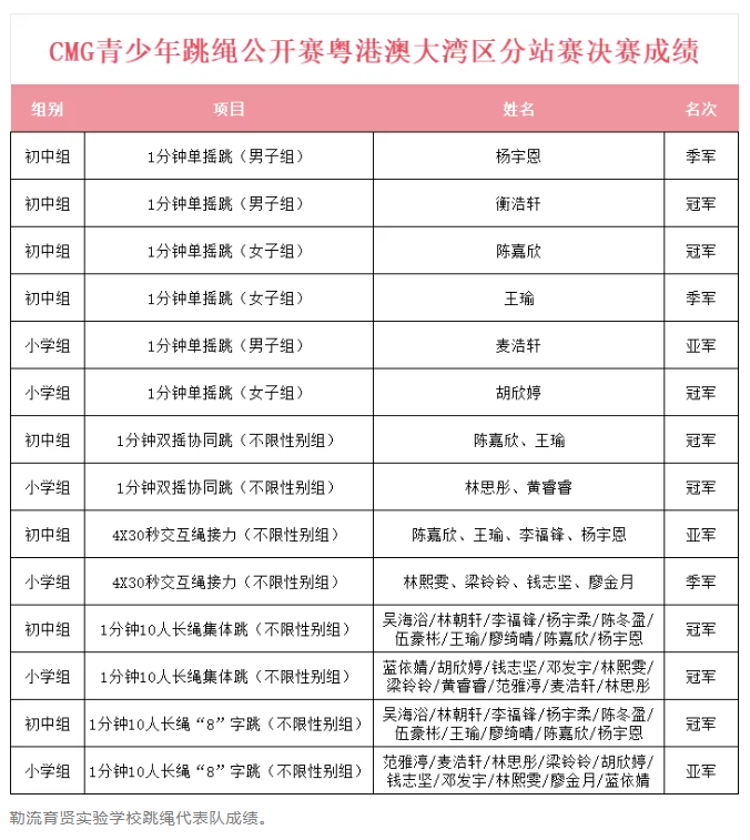 近日,首届CMG青少年跳绳公开赛·粤港澳大湾区分站赛在广州举行,50多所学校的500余名跳绳精英展开了为期两天的激烈角逐。佛山市顺德区勒流育贤实验学校跳绳代表队表现卓越,在众多强手中强势突围,斩获8项冠军、3项亚军、3项季军,其中3名选手创下超(平)世界纪录的辉煌成绩。